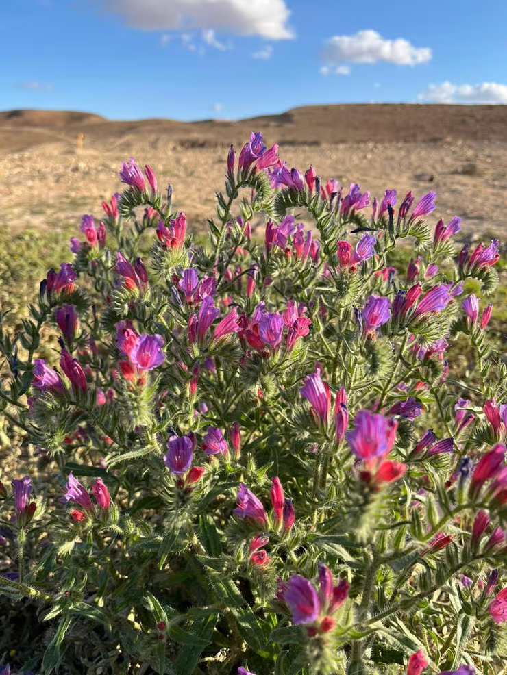 Пустыня расцвела и покрылась белыми, розовыми, фиолетовыми и красными красками. Из-за войны тысячи людей, желающих немного тишины вдали от сирен, отправились в пустыню, в том числе в Мицпе-Рамон и в региональный совет Рамат-ха-Негев. Они — одни из немногих, кто может насладиться этим впечатляющим цветением.