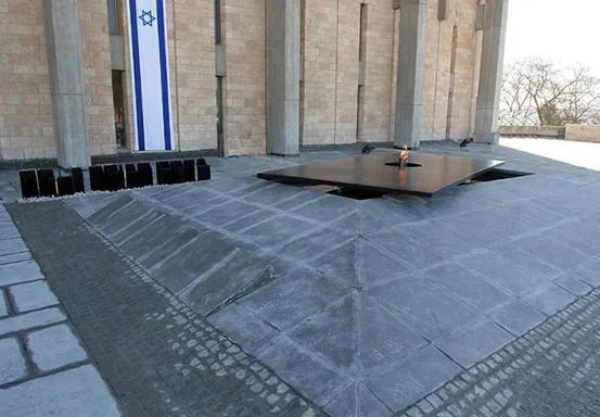 У входа в Кнессет стоит мемориал — вечный огонь, горящий над водной гладью, — в память о павших солдатах ЦАХАЛа.